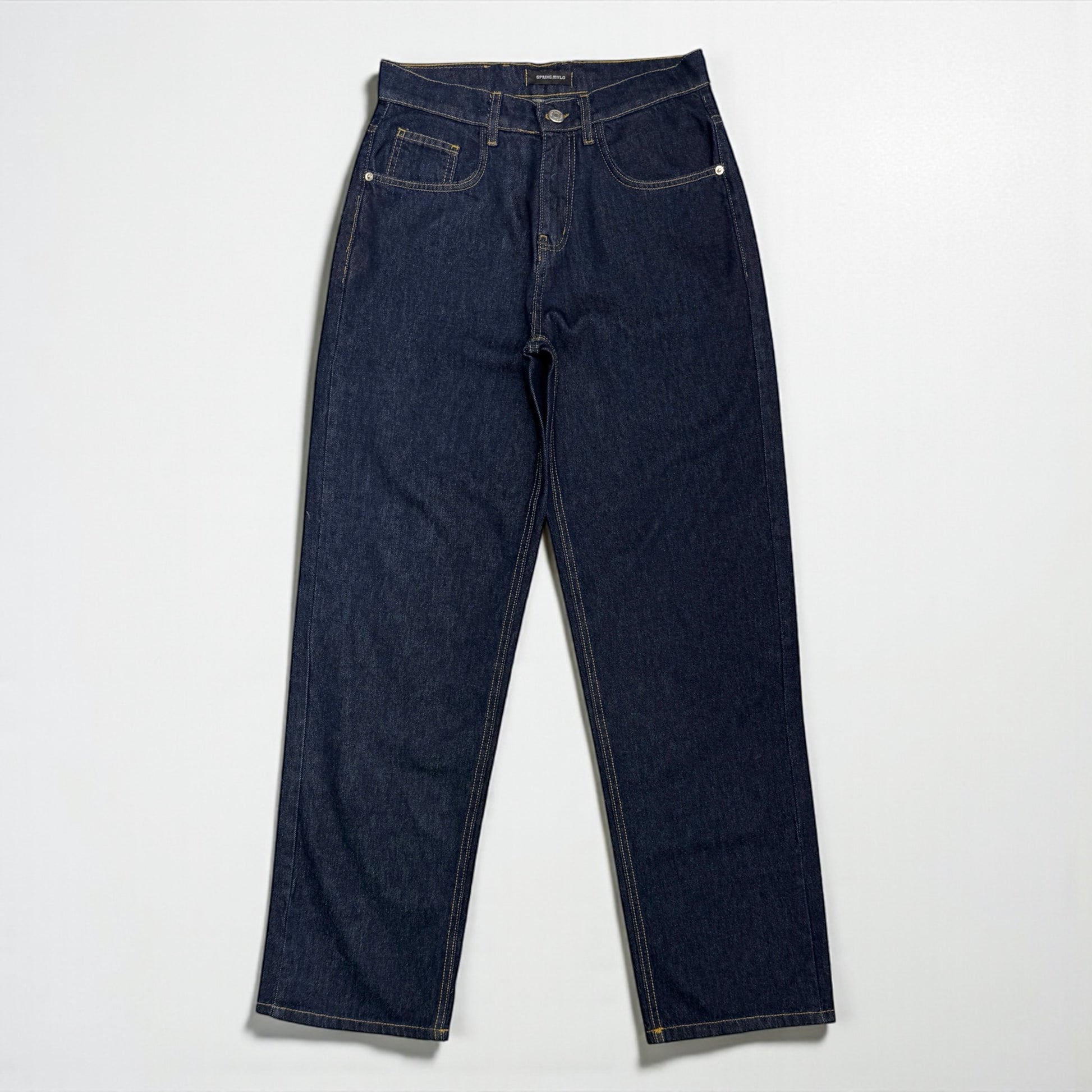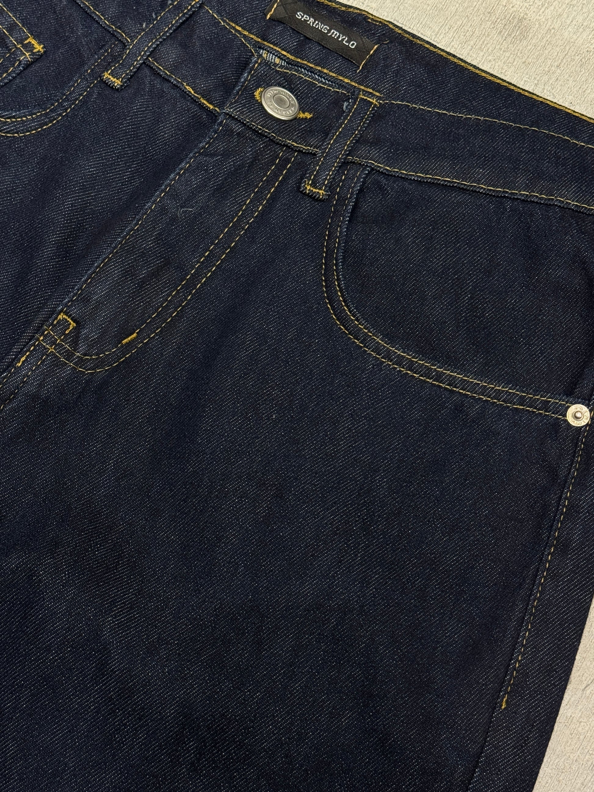 Raw denim pants with yellow stitching